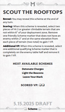 better dig out those modular houses. Credit: Wyrd GamesAt the end of each turn, if you revealed your Scheme, you discard it and choose a new one. Not just any, Scheme, though - each Scheme has a list of three Schemes it "branches" into. Thus, if you revealed Assassinate, you can next choose Harness the Ley Line, Runic Binding, or Frame Job. If you didn't score your Scheme that turn, you can still reveal it at end of turn and abandon it, getting no points for it but getting to pick a new one from the three follow-up options.