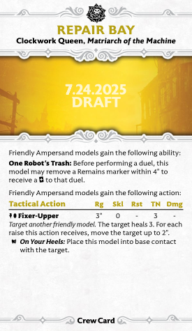 Let's start with Matriarch of the Machine - specifically with her crew card. Repair Bay is (almost) as straightforward as crew cards get: One Robot's Trash lets you convert Remains Markers directly to +twists to duels. Any duels, so it works offensively, defensively, and even when you're trying to get off a key tactical action. You will want a source of Remains Markers to power this ability up, but fortunately, the crew does not want for those.