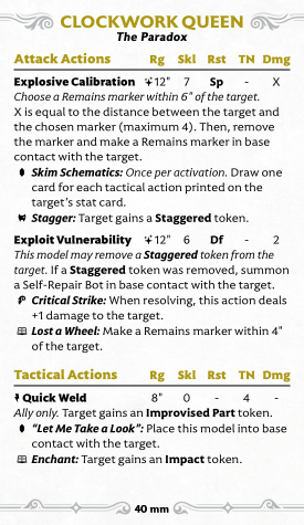 Her second Attack, Exploit Vulnerability, is an odd one. Also a long-ranged magic attack, but much weaker damage-wise. You can remove Staggered from the enemy to summon Self-Repair Bots (of which more later) into base contact with them, which is cute. It has crit strike, which is always nice to have, and the Lost a Wheel ability to make a Remains marker within 4", which is more significant (since it turns on Calibration).