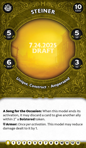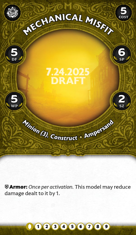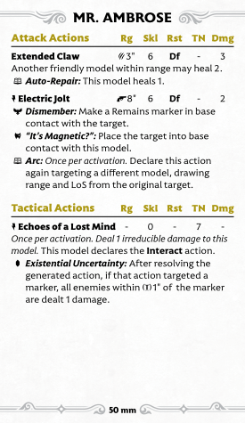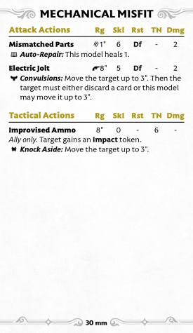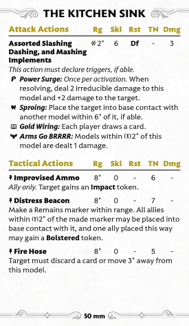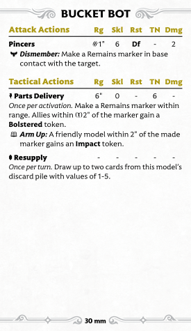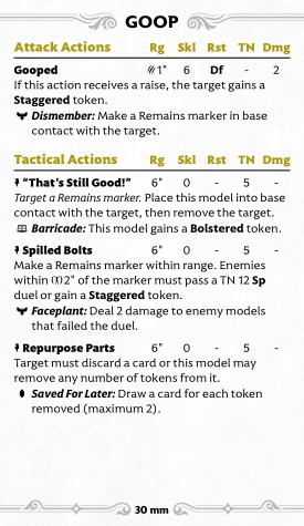Goop's melee isn't great, but Staggering enemies at least turns on his boss's summon. His tactical are much more interesting: there are three, and they're all Signature actions, which gives you a ton of versatility. Spilled Bolts simply creates Remains within 6", turning on many other crew abilities, and occasionally Staggering and even damaging enemies near the marker. "That's Still Good!", on the other hand, hoovers up a Remains marker to teleport Goop around and maybe even Bolster him. Finally, Repurpose Parts lets you eat tokens off friendlies or enemies (though enemies can discard a card to prevent it). You can also spend a soul stone to draw up to two cards, though typically this will only work if you are targeting a friendly as an enemy will just pitch a card to stop you (and you have to spend a Soulstone before they choose to do that or not).
