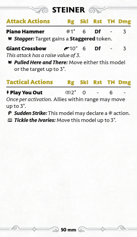 Steiner's signature action, Play You Out, is the kind of thing that has always been good in Malifaux: aoe movement helps you unpack, and though the range is short, Steiner's 50mm base means you can catch everyone you need to. It's only once per activation, but since it gives you either a 3" movement or a free attack, it's a good action even later in the game. This is probably the best action to copy with Improvised Parts, and handing out lots of Parts means even you cheap crappy minions will be pushing your whole crew up the board.