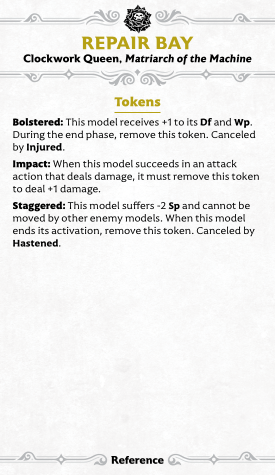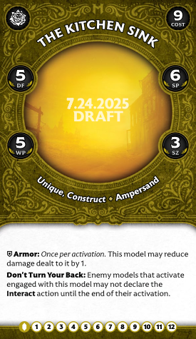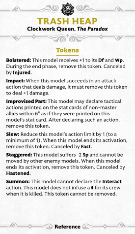 So what does the Power Bar do? Well, it scales up to 6 (pretty high, as these things go), and it powers up the TRASH CANNON. Any unique Ampersand model can fire it: it's a short-ranged magic attack that simply deals scaling damage based on the size of the power bar and drains it to zero. Luckily, it only drains if you hit, so once you're full, someone is getting torched for 6 damage. Presumably they're getting brained by a ballistic washing machine. Overall, though, this is a bit of a low-impact crew card... at least, on this side. The array of tokens is more interesting, including as it does the unique Improvised Part token. This allows models to declare tactical actions printed on the cards of non-master allies within 6". You only get one before removing the token, but that opens up amazing possibilities, as we will see below.