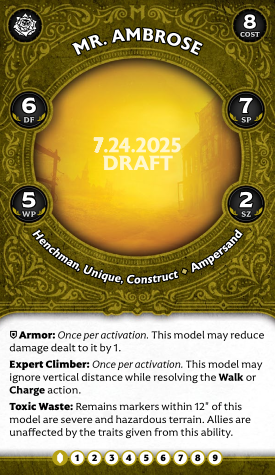 Every crew needs a model that can interact-walk-interact, preferably with some ability to ignore terrain or climb easily. Here's yours. Ambrose is very speedy, especially with Expert Climber, and just hard enough to remove to require opponents to dedicate effort to it. His 12" aura transforming Remains markers into Severe and Hazardous terrain is cute, but you will be eating them so fast that they're not likely to affect enemies that much.