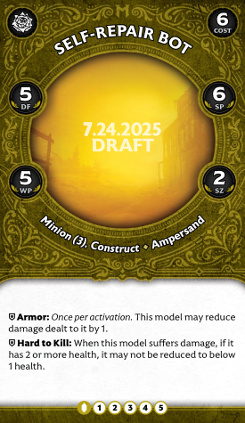 The first of Ampersand's two minions, these are a bit more fragile than Mechanical Misfits, but... in an odd way. 5 health with 5/5 defensive stats is "get murdered" territory, though Hard to Kill means it'll take two attacks. The bots have a crappy melee attack you never want to use, a not-quite-as-crappy ranged attack that can make Remains (and can cash them in to shoot for 3 damage, but not super reliably, since you must remove it before you see if you hit with your stat 5 attack), and a very odd tactical.