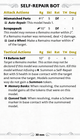 Reform Self costs a soulstone, and... kills yourself. Sort of. You need a Remains marker within 10", and you basically turn it into a full-health Self-Repair Bot, which is summoned but does not gain a Summon token, while killing yourself without getting a Soulstone for it. So you die and rebuild yourself? There's a trigger to let you keep all of your tokens and one to let you drop a Scheme. This is basically a full-heal and teleport 10" but with odd extra steps. This does let you drop the Summon token off of the ones that Paradox summons, at least