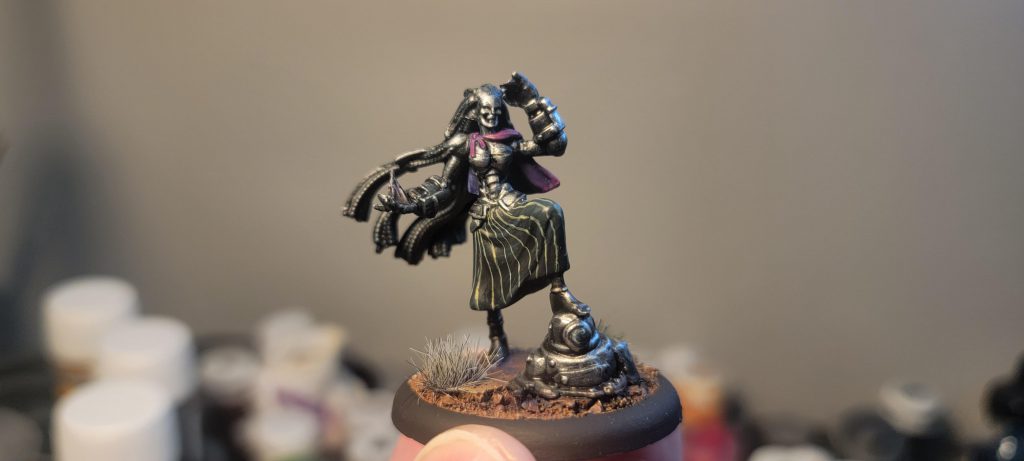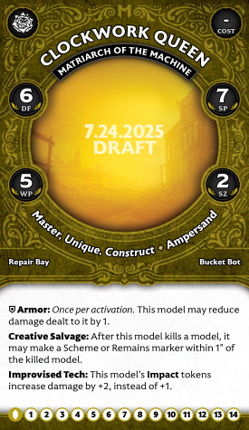 Matriarch of the Machines has a solid stat line for a Master: 6 df, 5 wp, the standard 14 hp, and Armor +1 make her reasonably durable, and at Mv 7 she's quite speedy. Creative Salvage lets her generate Schemes or extra Remains markers when killing enemies, which she will likely do a lot of, largely thanks to Improvised Tech. +2 damage for Impact Tokens instead of +1 seems marginal, but it really adds up.