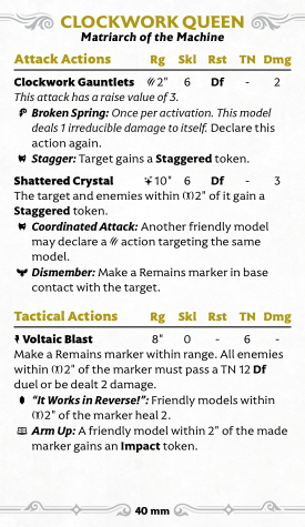 Her signature tactical, Voltaic Blast, also makes Remains markers, this time wherever you want within 8". The newly created pile of junk pulses out a little damage sometimes, but mostly you're just using it to make the Remains marker - although it can heal friendlies or hand out Impact. Probably the most straightforward use of this is to activate the Queen with an Impact token, hit someone, then use this to reload the Impact before hitting again.