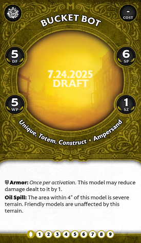 The Matriarch's totem, the Bucket Bot, might as well be called the Bolster Bot. It has Armor, but ineffective defensive stats and a weak attack mean you do not want this guy anywhere near the action. As he is significant, he can hold a backfield objective while pumping out Remains and making your crew more durable with Bolstered tokens (he also feeds the Matriarch Impact tokens). He's a solid utility totem, but that Oil Spill ability is more cute than good; anyone who can reach him won't be hampered by a little bit of rough terrain, and they will likely kill him fast.