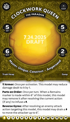 The Paradox switches her other form's Df and Wp, and is a lot slower at Mv 5, but is otherwise the same (armor included). She doesn't have Matriarch's double-impacts or Creative Salvage, but once per turn she can instantly gobble up a Remains marker that would be placed within 6" to infuse a Soulstone. An ability to reliably print Soulstones is great, and she even has a good spender: her defensive ability, Reverse Gyros, lets her spin a soulstone to move someone who attacked her 6", which is long enough that it will often both keep you safe and disrupt your opponent's plans. It doesn't reduce damage, though, and she doesn't have the massive healing potential of her original form, so beware.