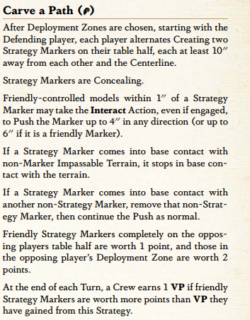 The fourth paragraph above is also worth a mention. Moving payloads eat every Marker they touch. This incidentally hoses some Crews, as it gives every model in your crew a version of Parker Barrows/Cornelius Basse's Chaos in the Badlands/Order in the Badlands. Titania with her Underbrush? Mah Tucket with her Pit Traps? Mei Feng with her Scrap? This Strategy hits them where it hurts (and to forestall anyone saying it: the Rock Hopper does not save your Scrap here, since it only prevents enemy effects from removing it, and the effect of the Strategy isn't an enemy effect; it's neutral). It's kind of unusual to have a line of text like that on a strat, since it definitely gut-punches some Masters in particular, but Markers have been kind of proliferating a lot lately and it's nice to see them reined in a bit.