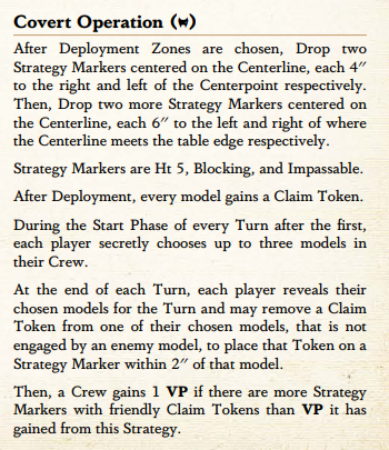 Covert Operations, our last Strategy, is a bit like Corrupted Ley Lines. There are four markers on the board. Each of your models has a Claim Token that can be used once, to claim one marker. Both players can claim a marker, but you have to claim all four to cap the strategy. The catch is that not everyone in your crew is eligible to claim a marker - at the start of each turn you secretly pick three to be your "scoring" models, and at the end of the turn one of those three that's not engaged by an enemy to claim a marker within 2" of them.