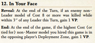 This is about an unsubtle as Schemes get. Are you playing Lady Justice? Do you want your Master to kill people? GET IN THERE! You can snipe out your opponent's lieutenant while they're standing next to the boss, but in practice 90% of the time you'll score this by decaffeinating someone with Lorelei, the Living Blade or aging them to dust with Death Touch. The endgame condition is worth considering; you don't secretly nominate the model, your opponent knows exactly who it is once you reveal, and if they die you don't renominate. Zipp is not half bad at this, but picking this scheme means you basically can't hire Mancha Roja. (The First Mate is great at it, though). You can play silly games by hiring a bunch of 8s rather than any 9s or 10s, and then any of them are eligible to score the endgame point.