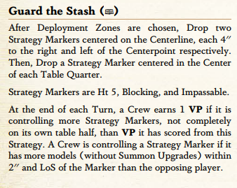 Guard the Stash deploys immobile Strategy markers of the kind we're used to, but in a new configuration. There's six, four on the four table quarters and two on the Centerline. Your mission? Control these markers by having more non-summoned models near them than the enemy does. The wrinkle? Markers fully on your side don't count.