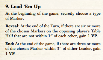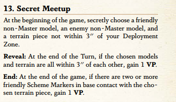 Assassinate, Spread Them Out, and Breakthrough are back with no changes at all. Not a problem in any case. Those are all winners; Spread's a bit harder than the other two, but with the Strategies pushing people to go a bit wider than in GG2, it might be taken more commonly, while Breakthrough and Assassinate are workhorse Schemes that saw a lot of play and probably will continue to.Leave Their Mark from GG1 also returns; this Claim Jump variant requires you to have a Scheme marker within 1" of the centerpoint while your opponent does not, and scores its endgame point if you have three scheme markers within 4" of the center. I always liked Claim Jump, and this scratches the same itch; it says "control the center of the table," basically.