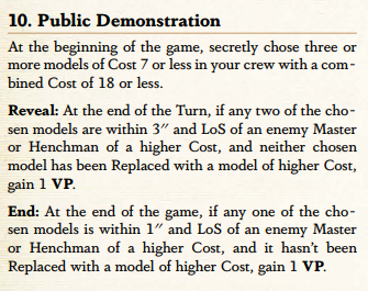 Because there's no interacting, this is a purely positional strat, and because it forces you to fight over markers there's gonna be a lot of blood in the streets. You can deny your opponent's scoring, but it's not that easy; if they commit two models, you need to commit two as well. This rewards crews who can take a lot of non-Insignificant models, since a three-stone Wicked Doll counts as much towards control as an 11-stone Rider, and so it affects your crew construction pretty significantly. You want durable, cheap models that can avoid being moved around. Waldgeists and Botanists, this is your time to shine!