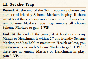 This one's a bit like Inverse Detonate Charges. You can theoretically score the reveal condition with a single Scheme marker, which is what I call AP efficiency. In practice, with this in the pool, your opponent won't dare bubble up. It's a scheme that really rewards ranged scheme-marker dropping and activation control, since you want to be able to safely flip a pancake in their faces after they've activated. It also kind of punishes the "lots of significant models" crew builds I discussed above, since it's easier to catch three of them out. I like Set the Trap quite a bit, but maybe that's because I play Austera and Twigge and Merris LaCroix, both of whom love this Scheme.