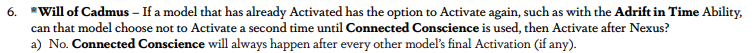 I like this. Will of Cadmus really relies on being the last thing that happens. It's a big part of the crew's power. Double-activating a model is not a common ability, but it's not as rare as it was. This will help Nexus against Asami, Tara, and Molly... and nobody else, right now, but maybe someday.