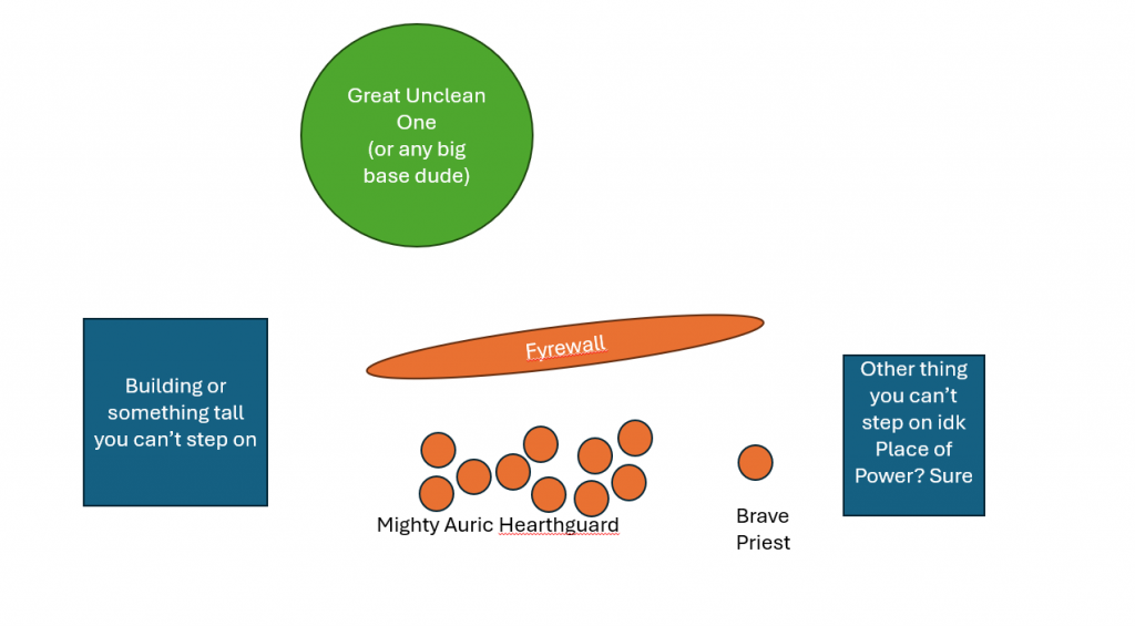 I have had this, basically exact, thing come up in game though that's why I'm illustrating it. My Auric Hearthguard were about to be removed by that Great Unclean One...until I summoned in a Fyrewall during his hero phase. My priest had failed a chant the turn before with the roll of a 2 (so a 3 with the place of power bonus) and was able to use those ritual points to just about guarantee the summon. The Great Unclean One is able to move through the manifestation but there's nowhere for his base to fit now, so he can't! He can charge the Fyrewall of course and waste a turn beating it to death but that still leaves me with Auric Hearthguard alive before going into my turn.