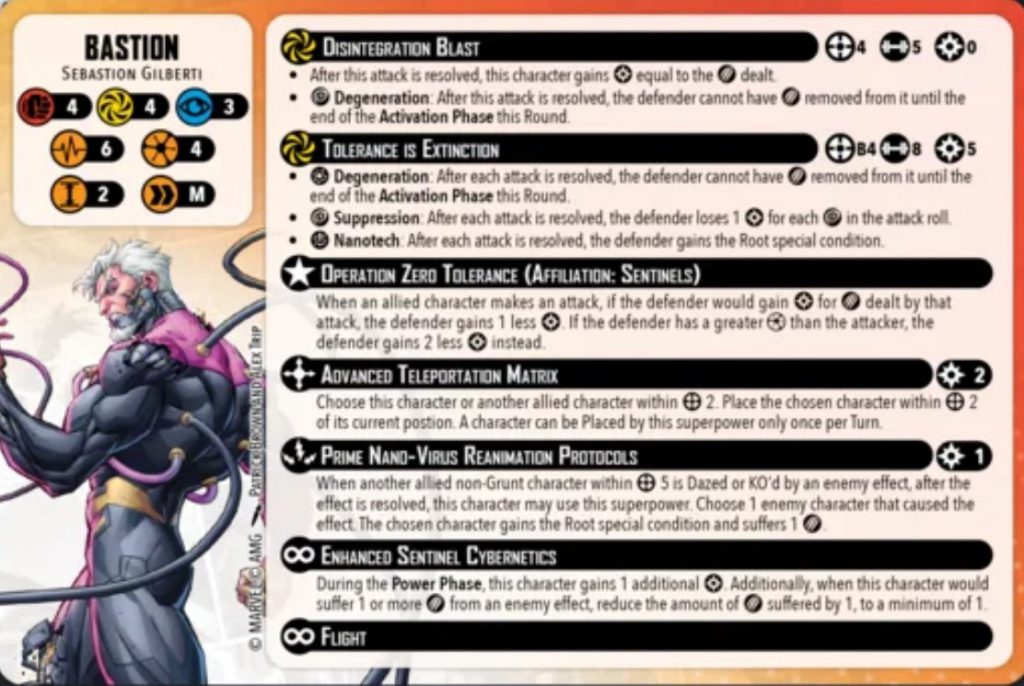 Bastion's first superpower is Advanced Teleportation Matrix. For 2 power he can choose himself or an ally within range 2 and place it within range 2. As we will see in a second Bastion begins the game on 2 power so he can use this immediately to place one of your Sentinels within range 2. On a large base sentinel model this can be a huge amount of movement.Prime Nano-Virus Reanimation Protocols is his second superpower. When an allied character is dazed or KO'd Bastion can pay 1 power to do a damage to the character that did it and give them the root condition.