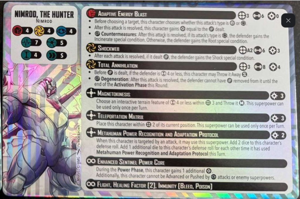Nimrod's first superpower is Magnetokinesis. For 3 power he can choose a size 4 or less terrain feature within range 3 and throw it medium. With the changes to collision damage, a size 4 terrain throw isn't as damaging as it used to be, but the ability to throw large terrain will still be useful. You can throw terrain to remove cover from an opponent or to improve lines of sight.Teleportation Matrix allows Nimrod to place himself within range 2 for 3 power. On his large base, a range 2 place covers a lot of distance. Anyone who has used the Hulk knows that he can get a lot of maneuverability from a range 2 place. Often this power will be the difference between being able to attack twice in a turn and needing to waste an action on movement.