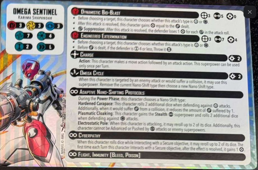 Omega Sentinel Credit Atomic Mass GamesOmega Sentinel is a 4 threat character with 3/3/3 defences and a long move. She has 7 health which appears to be the new standard moving forward for 4 threat characters. This stat line alone will make her very fast, and the relatively low defences will be mitigated with the rest of her card below.