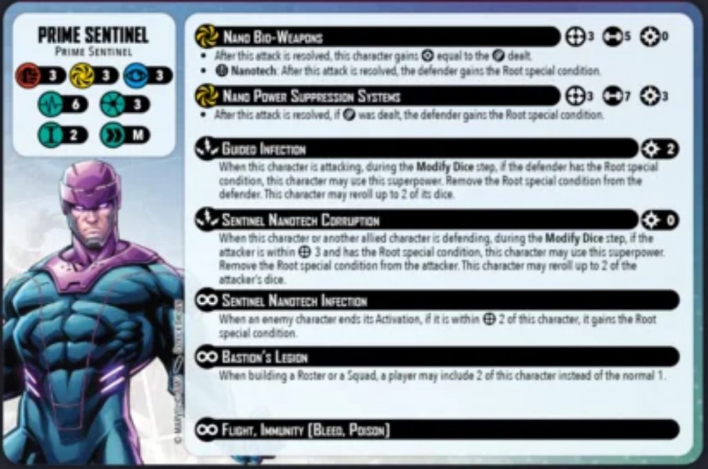 Guided Infection is the Prime Sentinel's first superpower. For 2 power when attacking an enemy with the root special condition they can remove root in order to reroll 2 dice. Considering they have multiple ways to give out root this can really bump up their offensive power. Additionally if the opponent has root you and you use Nano Bio-Weapons, you can remove root for the rerolls only to give them root after the attack is resolved assuming you hit the trigger.Sentinel Nanotech Corruption is a 0 cost reactive power that is triggered when an allied character within range 3 is defending. Remove root from the attacker in order to reroll 2 of the attacker's dice. The ability to reroll an opponent's attack dice is very strong and can turn off key triggers such as throws, special conditions or additional attacks. Additionally when you are trying to starve an opponent of power as Bastion's leadership wants to do this can be another way of doing so.