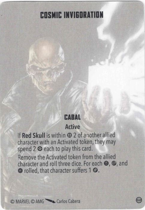 Let's start off with a good 'un. Cosmic Invigoration allows Red Skull and an allied character within Range 2 to spend 2 Power each, and remove the Activated token from the latter.