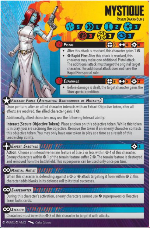 Mystique is pretty tricksy. Notably, her Shapeshifter ability means that Bodyguard-style moves can't be used against her; if she decides somebody is wearing 16 pistol rounds to the face, it's happening. Along with Raven's Long move and the guaranteed pull from her Deception card, this combos with All You've Got for a one-two punch that’s pretty hard to avoid.