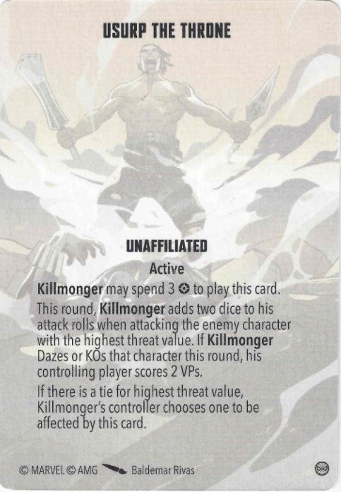 You remember how we said that Cabal likes whacking people? Well Killmonger's Usurp the Throne helps you do just that...and then gives you a little pat on the head for doing so. Not only do you get some help in taking down your opponent's centrepiece, you get 2 VPs as a kicker, and in a race to 16 that can really move the needle. You don't even need to wait until the Cleanup Phase, so you might just jump over the line and insta-win. Grade: A