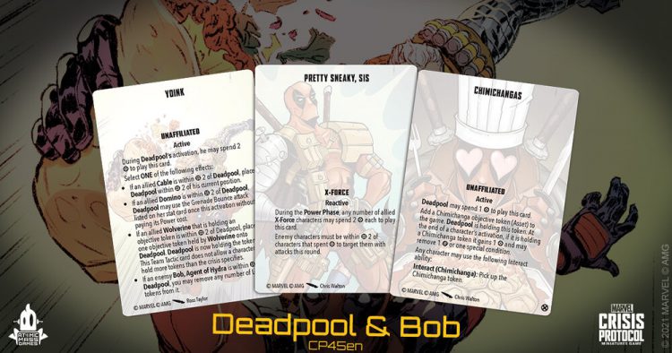 Deadpool himself has two other cards that have been revealed. Chimichangas introduces a chimichanga token into play. Whoever is holding the token (Deadpool starts with it) gains one Power and removes either one Wound or or one special condition each turn. It’s basically transferable Asgardian status. The token counts as an asset so if you’re carrying it you may not be able to pick up one of the crisis extract objectives, but it can be dropped and picked up (hopefully by allies). Grade: A-