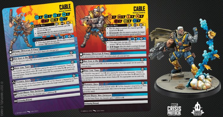 Cable, your mandatory affiliation leader, starts off with a solid Range 5 Strength 5 builder with Incinerate on a Wild. Not messing around here. His only other attack is a 6 Power AoE2 Strength 7 which also heals him (and on Cable’s Injured side can also give Stagger). The good news is that he gets an extra Power at the start of each round so he may eventually be able to use that attack. Cable also has a Range 2 teleport and can give himself or an ally within Range 3 two extra defense dice. To go with that defensive superpower he has 13 Stamina and a 3-3-4 defensive statline, so he’s fairly beefy. The big question is how does he stack up against other Threat 5 characters, and the answer is okay, I guess? He’s good, but not Angela or Modok good. Not even Dr Strange or Thor good if we’re talking other affiliation leaders. He’s versatile and would probably be undercosted at a 4, but I don’t feel very compelled to take him out of affiliation, where I’m required to do so. Grade: B
