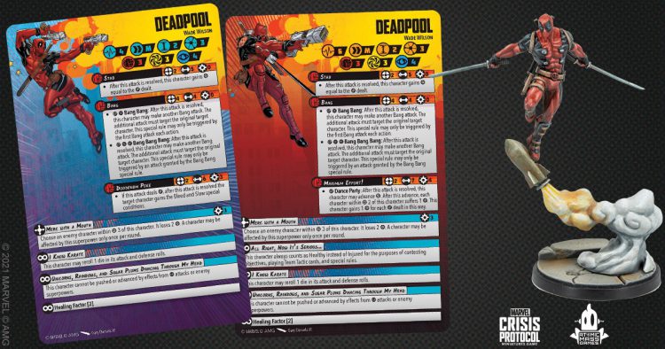 Lucky Shot attack the opponent doesn’t gain Power for the Wounds they receive. Super Annoying! How well she does on or how long she survives is going to be very much dependent on die rolls, with a heavy finger on the scale in her favor, but she looks like a lot of fun to play. Grade: B+Sometimes I think I’m the only nerd alive who can’t stand Deadpool. I’m really not looking forward to seeing him in the game. But the editors at Goonhammer say they will only let me see my family again if I finish this column, so I guess I have to talk about Deadpool. Fine. He’s got two builders, Range 2 and a little boring and a longer range one that has the potential to proc three total attacks. Sounds great on paper but with a pool of only 4 dice (even with 2 rerolls from Wetworks and his own superpower that gives him a reroll on attack and defense) getting the two/three Wilds needed is going to be tricky.