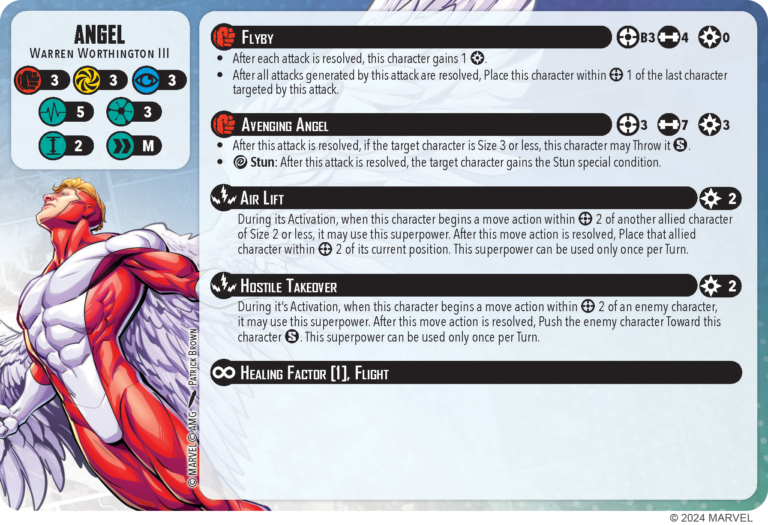 Credit: Atomic Mass GamesFor base stats, Angel has 3 defence in all areas which is fairly common for a 3 threat character however only 5 health on both his healthy and injured side makes him a little fragile. A medium base with a medium move and flight gives him good mobility which he may need to rely on to keep himself alive.