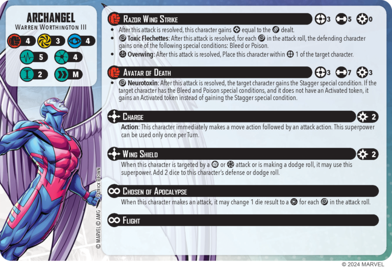 Avenging Angel is Angel's spender, a range 3, 7 dice physical attack for 3 power. After the attack it can throw a size 3 or less target short, and if a wild was rolled can give the target stun. There is a theme in the X-Men 3 threats of 3 cost, 7 dice spenders with varying effects. Unfortunately a stun and a size 3 throw after the fact may not be what Angel is looking for most of the time.