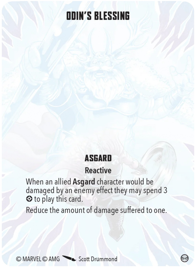 From https://www.atomicmassgames.com/Odin’s Blessing is one of the pre-eminent tactics cards in the game. The ability to functionally nullify a single attack is phenomenally powerful. This should make the short list for just about any Asgardian crisis team. It is limited to only affiliated characters.