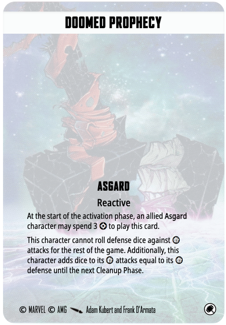 From https://www.atomicmassgames.com/Asgard has a list of potent tactics cards that are worthy (pun intended) of putting in your roster, if not in your crisis team. The saga of Thor in Marvel comics is full of portents and prophecies about the future, none more potent than Ragnarok. Of course, Ragnarok has come, been delayed, happened, cycled through, and then it was even a cyborg Thor for a minute.