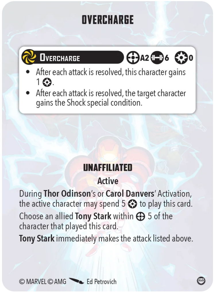 From https://www.atomicmassgames.com/For five power, any Thor Odinson or Carol Danvers can give Tony Stark a free, out of activation area attack that automatically shocks any targets and gives Tony one power per target.