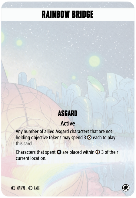 From https://www.atomicmassgames.com/Rainbow Bridge offers some extra movement to any number of Asgardian characters may spend three power to place range three away. Considering Bill, Skurge, Loki, Loki, Angela, Enchantress, and Heimdall all lack a charge, this is a solid way to get some extra movement. Movement outside of a model’s activation can be powerful as well, to pull a model to safety or hop to contest or capture an objective at the end of a round. Characters holding objectives cannot use this card. They can’t even drop an objective to take advantage of the card.
