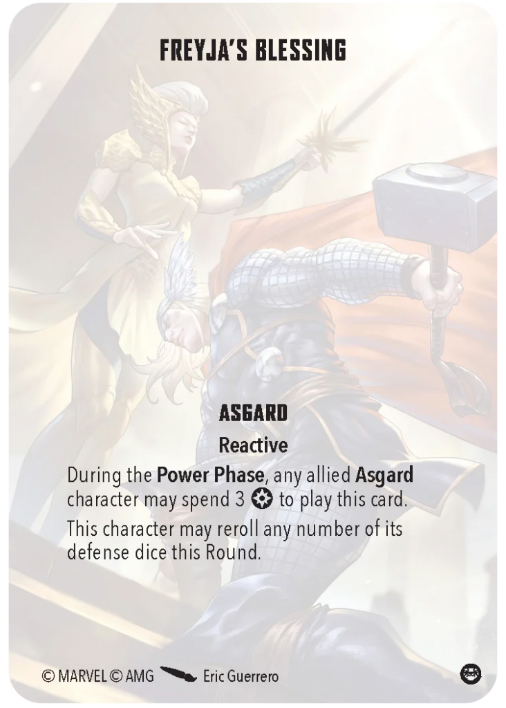 From https://www.atomicmassgames.com/When Freyja offers her blessing to any affiliated character, they get to reroll any number of defense dice through the round in exchange for three power. This can be a way to keep an important model on the table for longer. Unfortunately for Freyja, Asgard is spoiled for choice, so this card is competing against some very good ones.