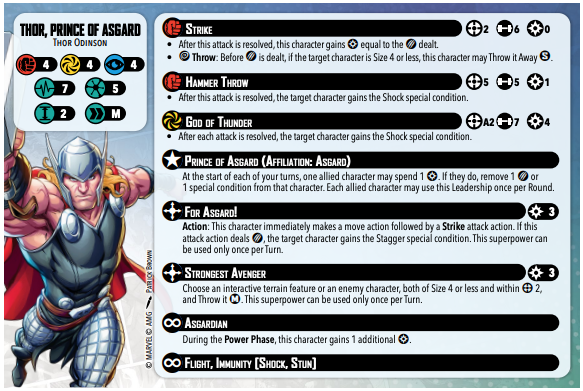 In my mind, Thor’s real strength comes from being the Strongest Avenger. A size four character or terrain throw at range medium is top tier. There are only a couple of models that Thor can’t throw. He can displace most models. Alternatively, he can add up to five damage to an activation for the cost of three power.