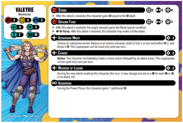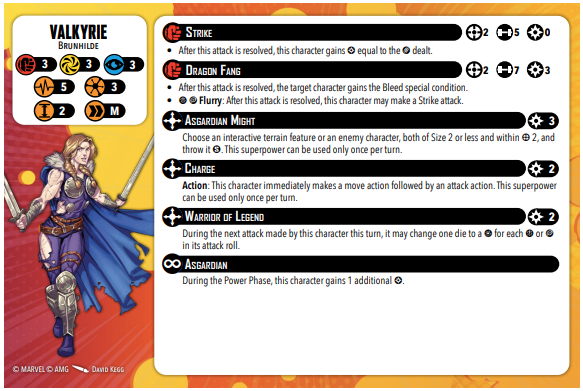 Valkyrie’s stat line begins like many other three threat characters: three for all of her defenses, eleven stamina with six on the front and five on her injured side. This means that it’s important to carefully consider where and when to have Valkyrie rush in, because she has a tendency to daze quickly.While her defenses are on the mid to low end of three threat models, her offensive output can be phenomenal. Her Strike (this was before AMG started giving fun and characterful names to basic attacks) is a standard range two, five dice, and gains power equal to damage dealt.