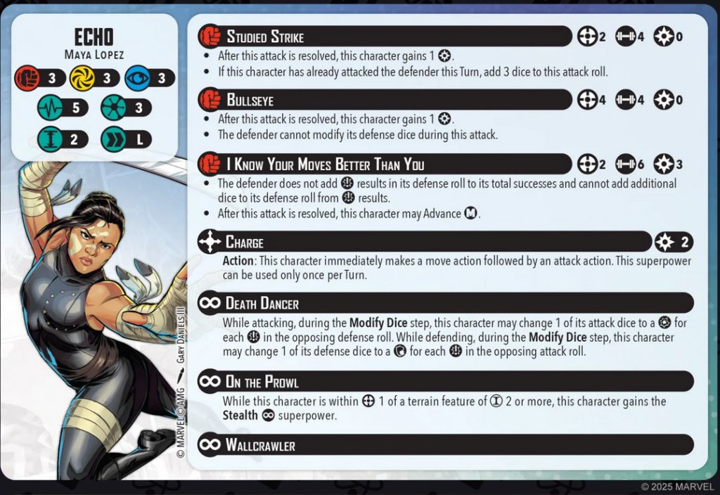 Her first attack is Studied Strike, a range 2, 4-dice physical attack. She gains one power when using this attack, and if she has already attacked the target this round, she can increase this to a 7-dice attack. This is a very similar attack to what we’ve seen on Ghost-Spider, although slightly worse than Ghost-Spider’s version, as Echo can only ever gain one power and does not have the potential for a move action off of it.