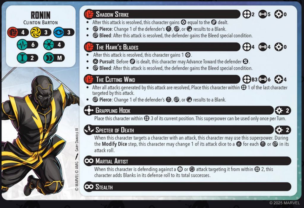 Finally, Ronin has two passive abilities, both of which are defensive. Martial Artist lets him count blanks from physical and energy attacks within range 2, and Stealth means he can’t be targeted from outside range 3. This combination makes a solid defensive kit. Though it does have a notable weakness from between range 2 and 3 where he is vulnerable. His one weakness is Mystic attacks, where he lacks the blank-counting he has on the other two attack types.