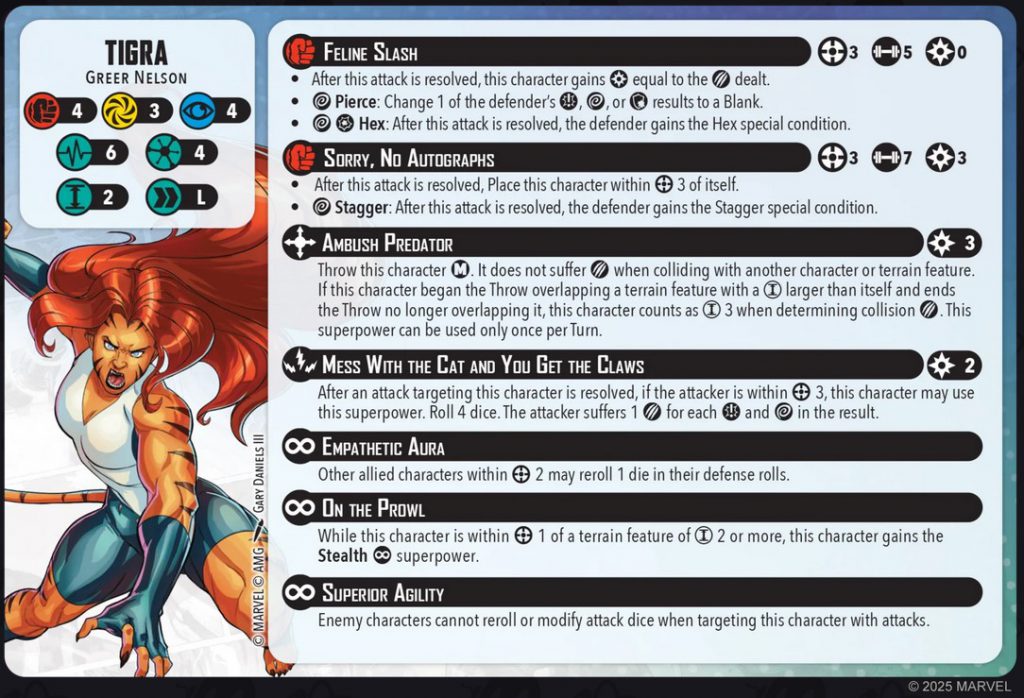 Tigra Character Card. Credit Atomic Mass GamesTigra is a 4-threat character with 4/3/4 defenses and 6 health on both sides of her card. She has a long move, making her faster than the average 4-threat.