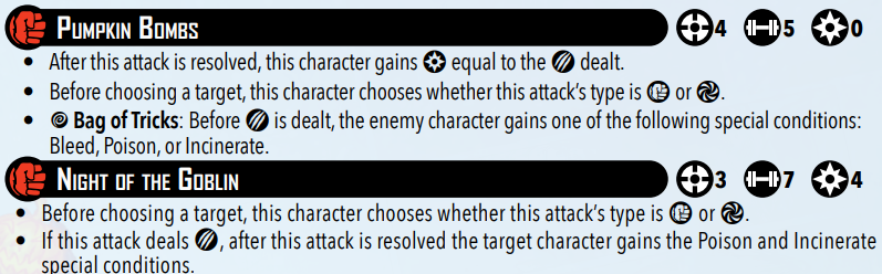 Pumpkin Bombs and Night of the Goblin are respectable attacks with the possibility of dropping conditions on the opponent. His builder requires a wild to do so, but choosing the most relevant between Incinerate, Bleed, and Poison and between making the attack Physical or Energy makes it potent. Night of the Goblin eschews Bleed from its effect, but the trade-off is that it applies both Incinerate and Poison simultaneously, with the only pre-requisite being damage. The drawback is that Night of the Goblin costs 4 Power. It’s useful when Goblin is flush with Power or when it’s very important to sneak a bit more damage or the conditions through, but Norman is likely to use Pumpkin Bombs much more regularly.