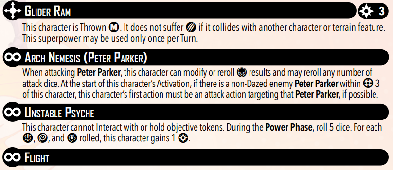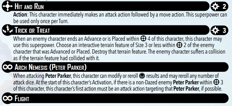 Moving down Goblin’s Card reveals a suite of diverse superpowers that help Norman get around the battlefield and threaten enemy models with extra damage. Hit and Run is very straightforward and makes good use of Goblin’s 50mm base, and Trick or Treat functionally acts as an out-of-activation terrain throw that can threaten to daze opposing models on their own activation. Arch Nemesis: Peter Parker is an incredibly niche ability given it doesn’t do anything unless the opponent has a Peter Parker on the board, but allowing Green Goblin to re-roll any dice is powerful, and the mandate that his first action must be an attack if Peter is within Range 3 lets it delay Stagger as it temporarily overrides the effect.
