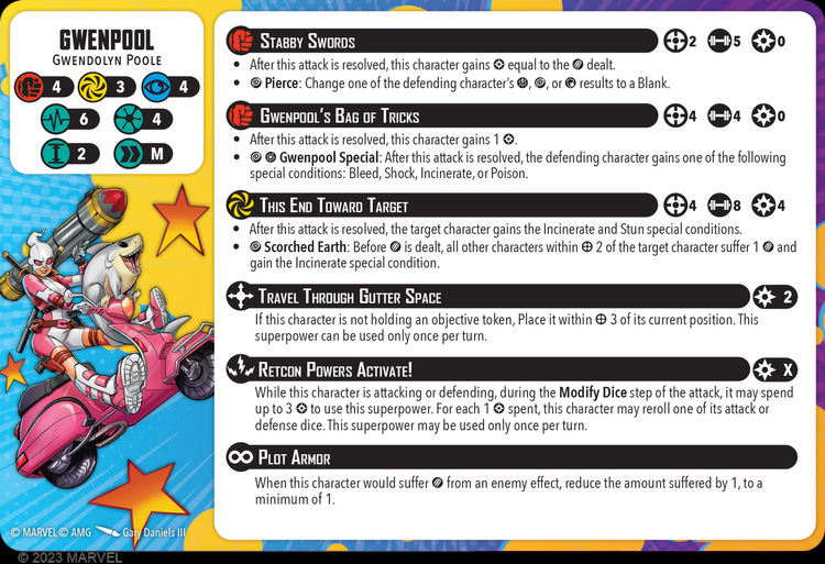 Gwenpool Character Card - courtesy of Atomic Mass GamesGwenpool is a 4-Threat character with 4/3/4 defenses, 6/6 stamina, and a medium move. She has two physical builders, one at Range 2 with 5 Attack which can Pierce; and one at Range 4 and 4 Power that can inflict one of a variety of conditions with a Hit and a Wild. Neither of these are especially impressive, but Gwenpool’s rocket launcher spender This End Towards Target is an appropriately explosive Range 4, 8-dice attack for 4 Power, that automatically inflicts Incinerate and Stun on the target, and causes 1 damage and Incinerate to all characters within Range 2 of the target on a Wild.