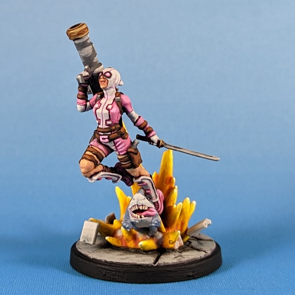 Gwenpool and Jeff the Land Shark painted for Marvel Crisis Protocol by Crab-stuffed MushroomsGwenpool is a dimension-travelling, fourth-wall-breaking, probably insane, and mostly very silly character, who is one of the newer members of the Marvel Comics stable.