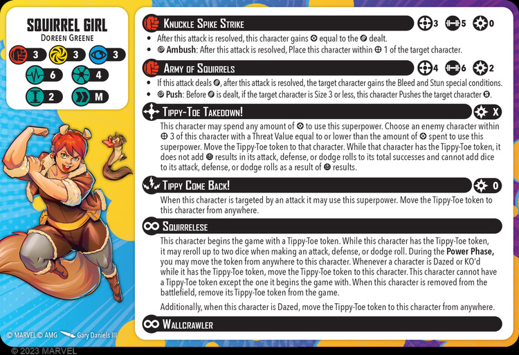 Squirrel Girl Character Card - courtesy of Atomic Mass GamesSquirrel Girl is a 4-Threat character. She has a fairly humble 3 Defense across the board, 6 Stamina on her healthy side, 5 on her injured side, is Size 2 and has Medium move. So far, not so impressive.