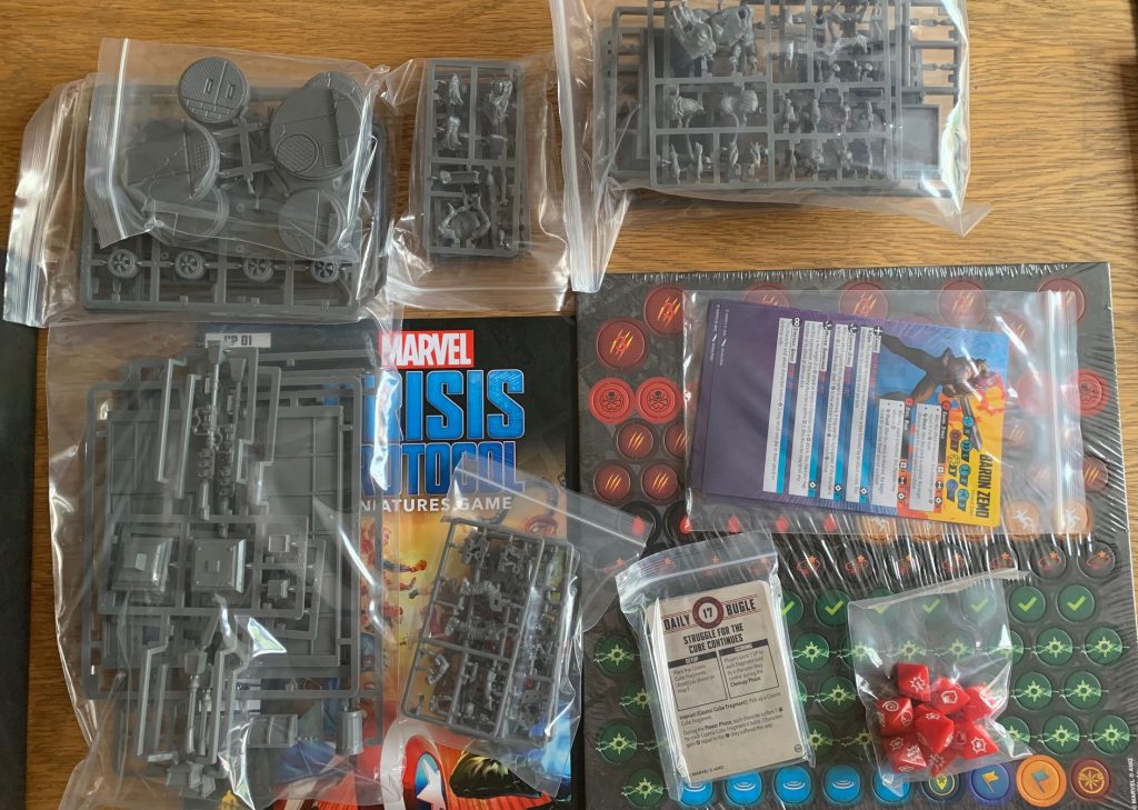 Marvel Crisis Protocol Core Set contentsWell we got a lot of stuff in the box! 10 characters, a bunch of terrain, dice, rulers, tokens and the rules themselves. The box effectively allows you to jump straight into playing the full game with a five-on-five heroes vs villains battle.